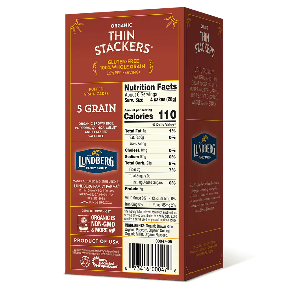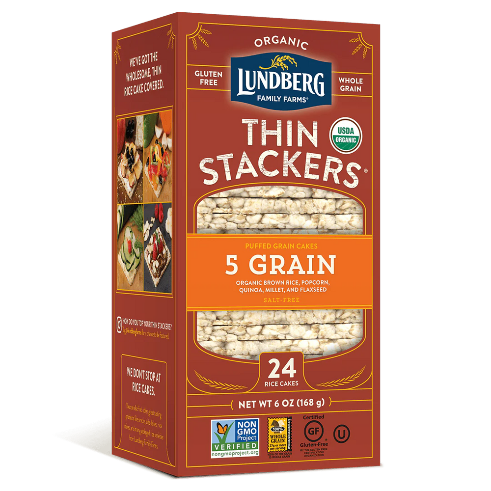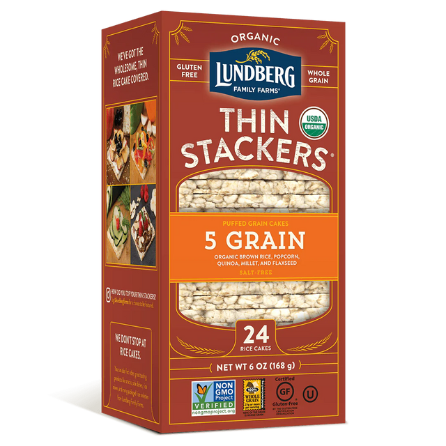 • Include Thin Stackers in your pantry: With so many versatile ways to enjoy Lundberg Thin Stackers or with delicious toppings, stock up on this 6-pack containing 24 rice cakes in each box.