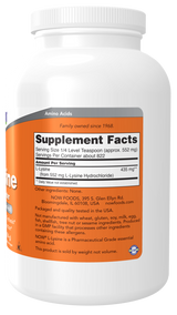 Lysine is an essential amino acid that must be obtained through the diet or through supplementation. Lysine is necessary for the production of all proteins in the body, and is required for the maintenance of the structural proteins collagen and elastin, which form all connective tissue such as skin, tendon, and bone.* Lysine is also a precursor to carnitine, which is needed for fat metabolism and energy production.* In addition, lysine may help to support a healthy immune system and proper cardiovascular function.*