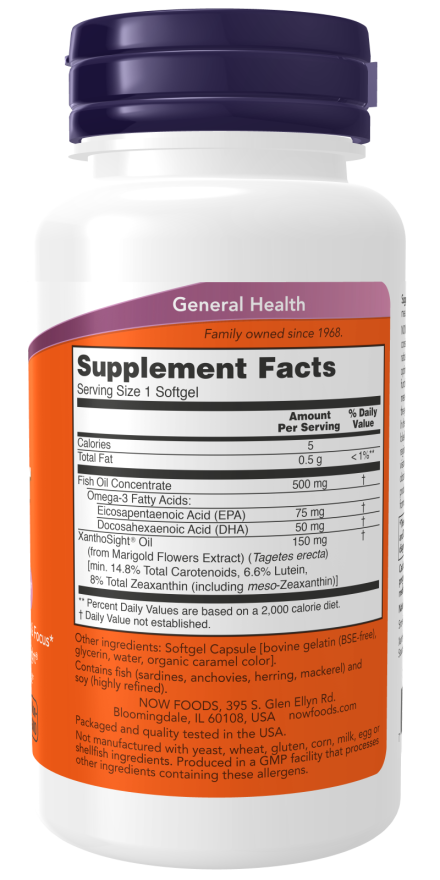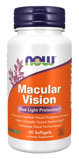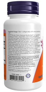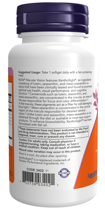 NOW® Macular Vision features XanthoSight®, an ingredient consisting of lutein, zeaxanthin, and meso-zeaxanthin in ratios that have been clinically tested and found to promote optimal eye health, visual performance, and cognitive function.* Carotenoids such as lutein, zeaxanthin, and meso-zeaxanthin, are concentrated in the macula, an area of the eye responsible for focus and color differentiation.* In the macula, these pigments act as a filter for cell-damaging blue light.* Meso-zeaxanthin is concentrated in the central region of the macula responsible for detailed central vision.* Unlike lutein and zeaxanthin, meso-zeaxanthin is not obtained through the diet or available in most eye support products. To enhance bioavailability, XanthoSight® has been formulated with fish oil.
