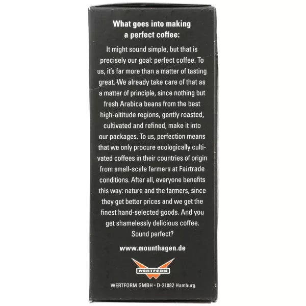 Mount Hagen coffee sticks are perfect for small households, no need to brew a whole pot when one cup will do. Students, when burning the midnight oil (or not) for that extra boost. Cooking, easy way to add a bit of coffee flavor to your favorite recipes. Specialty coffee lovers, start with a base of warm milk instead of water to create your own cafe latte, Irish coffee, anyone? Campers, totally portable Fairtrade coffee in an instant; no equipment required. Vacation: never be without your perfect cup of Fairtrade Mount Hagen, again without packing a coffee pot in your luggage. What goes into making a perfect coffee: it might sound simple, but that is precisely our goal: perfect coffee. To us, it's far more than a matter of tasting great. We already take care of that as a matter of principle, since nothing but fresh Arabica beans from the best high-altitude regions, gently roasted, cultivated, and refined, make it into our packages. To us, perfection means that we only procure ecologically cultivated coffees in their countries of origin from small-scale farmers at Fairtrade conditions. After all, everyone benefits this way: nature and the farmers, since they get better prices, and we get the finest hand selected goods. And you get shamelessly delicious coffee. Sound perfect? Fairtrade. Fairtrade certified and sourced from Fairtrade producers. Fairtrade means fairer trading conditions and opportunities for producers in developing countries to invest in their businesses and communities for a sustainable future. Processed in Germany.