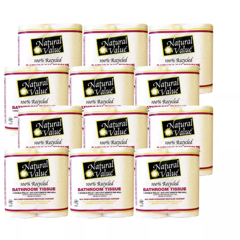 The Natural Value 100% Recycled Bathroom Tissue is an eco-friendly option for your bathroom needs. This case includes 12 packs, each containing 4 rolls of 2-ply tissue. With 400 sheets per roll, you can be sure that this bathroom tissue will last you a long time. Made from 100% recycled materials, this tissue is not only soft and absorbent but also helps reduce waste and protect the environment. It is a great choice for those who are conscious about sustainability and want to make a positive impact.