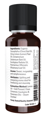 Ingredients: Eugenia Caryophyllus (Clove) Bud Oil, Citrus Limon (Lemon) Peel Oil, Cinnamomum Zeylanicum Bark Oil, Eucalyptus Radiata Oil, Rosmarinus Officinalis (Rosemary) Leaf Oil.