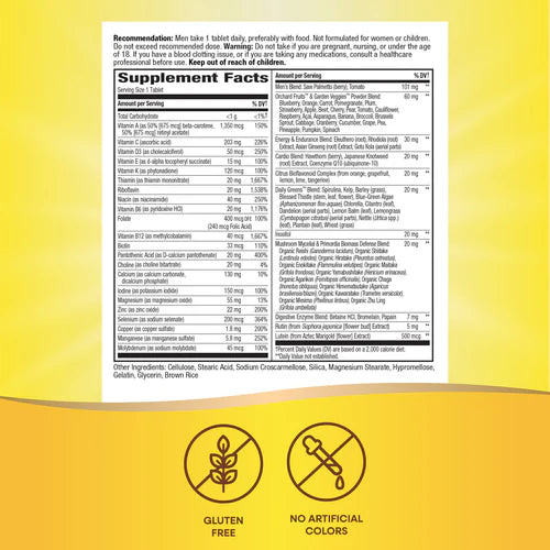 Contains unique food-based Orchard Fruits™ & Garden Veggies™ powder blend plus Men’s, Energy & Endurance, Cardio, Daily Greens™, Digestive Enzyme, Mushroom Mycelial & Primordia Biomass, and Citrus Bioflavonoid powder blends.