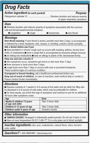 Pelargonium sidoides 1X helps reduce the severity of nasal and bronchial irritations, congestion, sore throat, and cough.