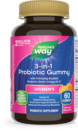 Nature’s Way 3-in-1 Women’s Probiotic Gummy takes a three-pronged approach to support your digestive and vaginal health and reduce occasional bloating.* They’re formulated with the clinically studied probiotic strain Unique IS-2® to reduce digestive discomfort.* Gummies add good bacteria to the GI tract, promote digestive regularity, and help support balanced vaginal flora.* This innovative probiotic gummy means you can easily care for your vaginal and digestive health in one simple step.