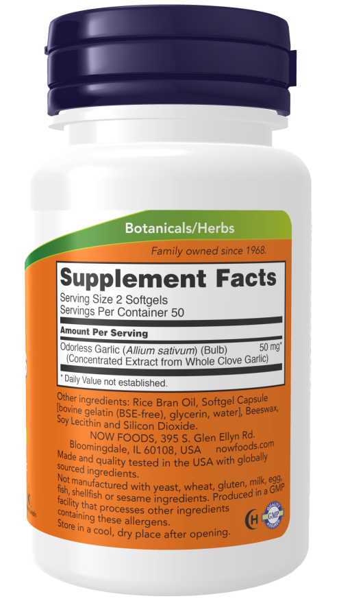 NOW® Odorless Garlic is extracted from Allium sativum. This odorless garlic extract is highly purified and has been deodorized while maintaining the nutritional value of garlic. Garlic abounds with naturally occurring sulfur compounds, amino acids and trace minerals.