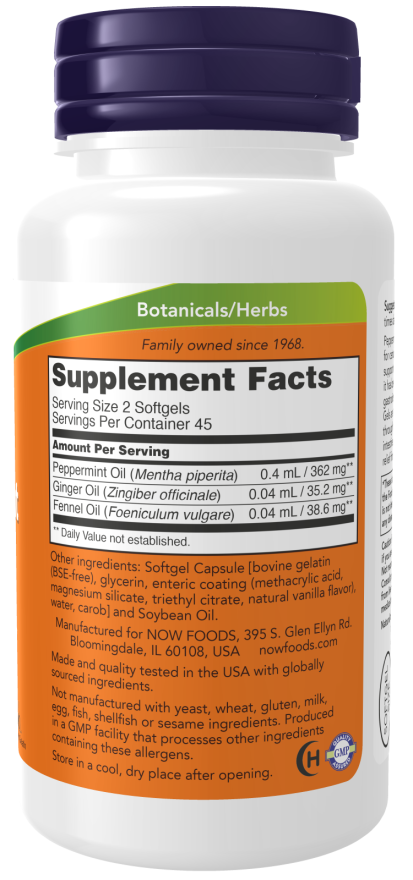 Peppermint oil has been recommended for centuries by traditional herbalists for the support of healthy digestion.* More recently, it has been found to support normal gastrointestinal function.* NOW® Peppermint Gels are enteric coated to allow passage through the stomach and release within the intestines where it can be helpful in providing relief from occasional minor bowel discomfort.*