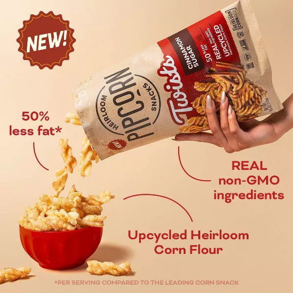 We’re bringing a new twist to the snack game! The irresistible Pipcorn crunch meets the classic flavor, Cinnamon Sugar, for a uniquely satisfying, omg-I-finished-the-bag snacking experience. Our all-new Twists are made with sustainability in mind by using upcycled Heirloom corn flour to create a flavor-packed shape that’s light, airy, and oh-so-crispy! You might even forget that Twists are better for you, too!