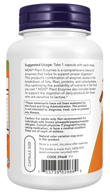 NOW® Plant Enzymes is a comprehensive blend of enzymes that helps to support proper digestion.* This product's combination of enzymes assists in the breakdown of fats, fiber, proteins, and carbohydrates, thus optimizing the availability of nutrients in the food you eat.* NOW® Plant Enzymes also includes lactase to support the digestion of dairy products for those who are sensitive to lactose.*