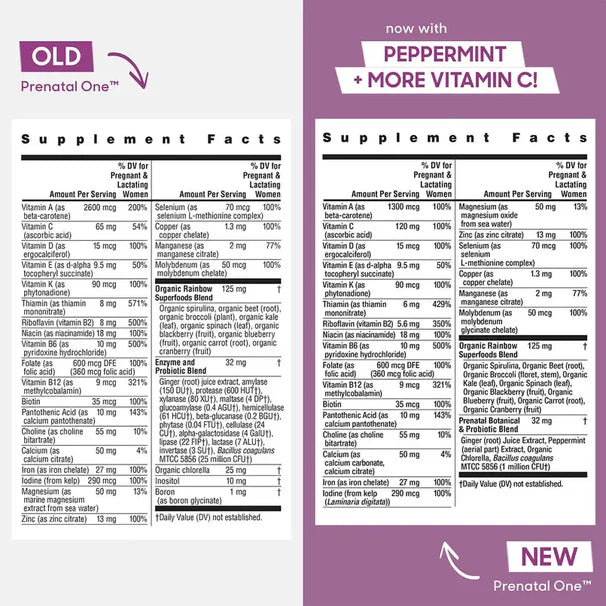Pregnancy and nursing place increased nutritional demands on your body, and it can be challenging to get all the nutrients your body—and your baby’s body—need to thrive from food alone. Rainbow Light Prenatal One Multivitamin is formulated to help fill in the nutritional gaps common throughout pregnancy and nursing with high-potency amounts (100% or more of the recommended Daily Value) of 18 essential vitamins and minerals—in just ONE daily tablet.
