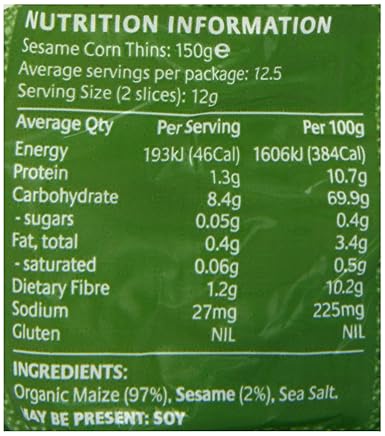 Real Foods Sesame Corn Thins are the best tasting wholegrain popped corn cakes you can buy. Made with a great recipe for maximum crunch and flavor, they taste sensational on their own or with any number of delicious toppings. Our Sesame Corn Thins are made simply by popping organic grains of corn, with added organic sesame seeds, under high temperature. Being fat free and all natural, Real Foods Corn Thins really are good for you. Real Food is proud to be producing wholesome and natural products for people who enjoy great tasting real food. Delicious with: Chicken, spring onions and pesto mayonnaise. Curried egg salad and roast capsicum with a sprig of dill. Non GMO - contains no genetically modified ingredients. TM Trade Mark.