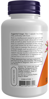 Rutin is a bioflavonoid related to quercetin and hesperidin found in both citrus and non-citrus fruits, as well as other foods such as buckwheat. Rutin is a powerful combatant of free radicals and is best known for its role in vascular health.* Rutin helps to maintain the structural integrity of blood vessels, such as veins and capillaries.* Scientific studies suggest that it may help to support vascular function and promote healthy circulation.* NOW® Rutin is vegetarian and derived from a non-citrus source.