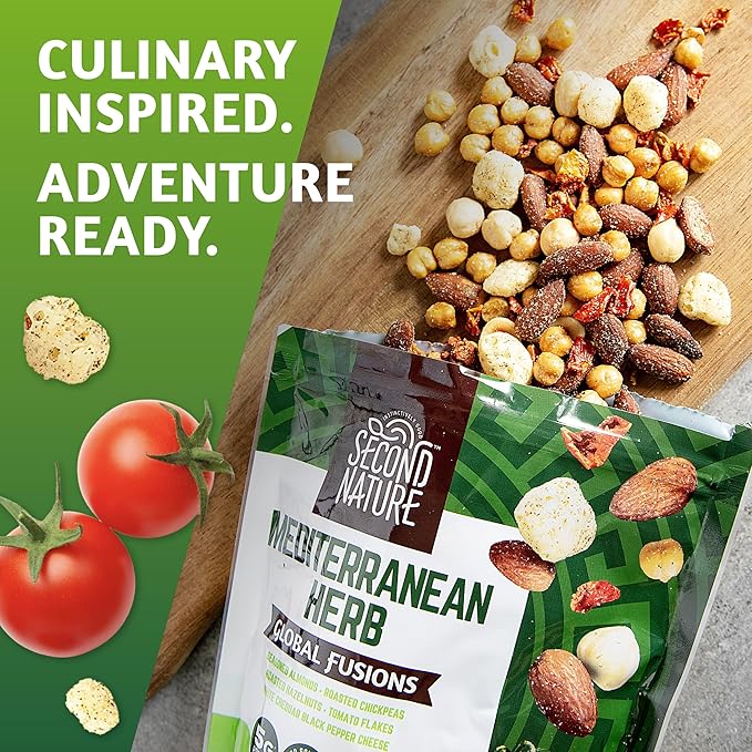 - MEDITERRANEAN HERBAL GLOBAL FUSSIONS: This blend offers 5g of protein per serving from Italian herb-seasoned almonds, crunchy hazelnuts and chickpeas, and dry cheese chunks with bright tomato flakes. This fiber-boosting blend also provides a good source of antioxidant vitamin E – Grazie!