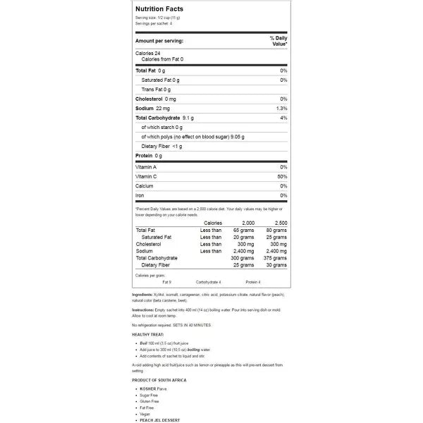 Peach Dessert Jel by Simply Delish is so delicious you'll never believe that it is sugar free! A natural source of vitamin C, Peach Dessert Jel has only 6 calories per serving and is gluten, fat and sugar free. Kosher and vegan friendly.
