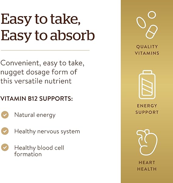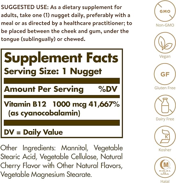 • Convenient dosage; Solgar Sublingual 1000 mcg Vitamin B12 nuggets melt under the tongue for fast and easy absorption