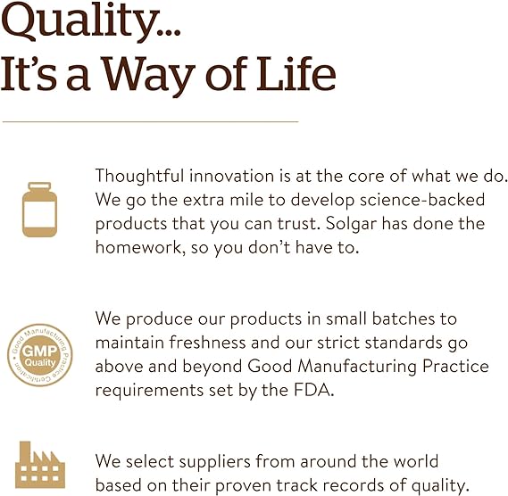 • The Gold Standard: For over 70 years, Solgar has been committed to quality, health and wellness. Our mission is to create the finest nutritional supplements in small batches, through tireless research, using only the finest raw materials.
