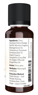 Ingredients: Citrus Aurantium Dulcis (Orange) Peel Oil, Myristica Fragrans (Nutmeg) Kernel Oil, Cinnamomum Zeylanicum (Cinnamon) Bark Oil, Organic Eugenia Caryophyllus (Clove) Bud Oil, Zingiber Officinale (Ginger) Root Oil.