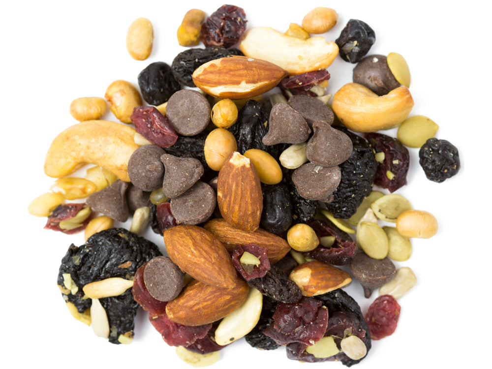 | Ingredients | Dark Chocolate Chips (unsweetened chocolate, calcium carbonate, cane sugar, cocoa butter, soy or sunflower lecithin [emulsifier], vanilla [milk]), Cranberries (cranberries, cane sugar, sunflower oil), Pumpkin Seeds, Raisins (raisins, sunflower oil), Dry Roasted Almonds, Sunflower Seeds, Dry Roasted Cashews, Organic Roasted Soy Nuts (organic soybeans, salt, organic sunflower and/or canola oil), Cherries, Pistachios, Blueberries (blueberries, cane sugar, sunflower oil). |