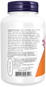 NOW® Sunflower Lecithin has phosphatidyl choline, the most abundant phospholipid in the cell membrane, where it plays a key role in cellular signaling and synaptic function.* NOW® Sunflower Lecithin also naturally abounds in phosphatidyl inositol, phosphatidyl ethanolamine, and essential fatty acids. Lecithin in the diet aids in emulsifying fats, enabling them to be dispersed in water; and as a choline-containing phospholipid, its choline is easily absorbed and utilized by the body.* NOW® Sunflower Lecithin Softgels are non-GMO and soy-free.