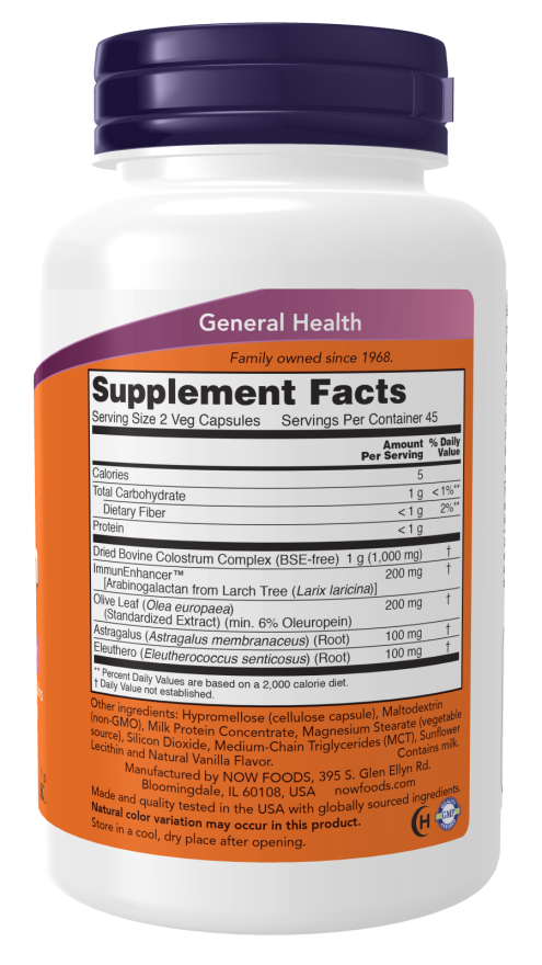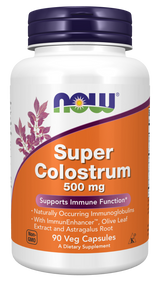 NOW® Super Colostrum combines colostrum with the herbal ingredients, larch arabinogalactan, olive leaf and astragalus to maximize immune system support.* Colostrum has naturally occurring immunoglobulins IgG, IgM and IgA, which are important immunological proteins for both animals and humans.* In addition, NOW has also included eleuthero to support a healthy response to typical, everyday stress.*