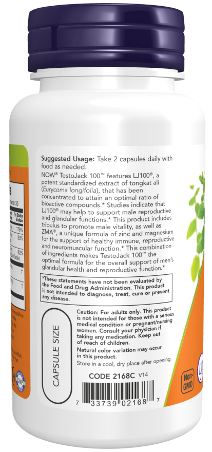 NOW® TestoJack 100™ features LJ100®, a potent standardized extract of tongkat ali (Eurycoma longifolia), that has been concentrated to attain an optimal ratio of bioactive compounds.* Studies indicate that LJ100® may help to support male reproductive and glandular functions.* This product includes tribulus to promote male vitality, as well as ZMA®, a unique formula of zinc and magnesium for the support of healthy immune, reproductive and neuromuscular function.* This combination of ingredients makes TestoJack 100™ the optimal formula for the overall support of men’s glandular health and reproductive function.*
