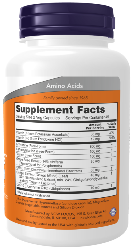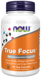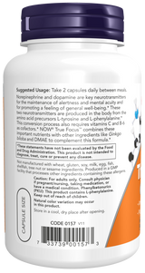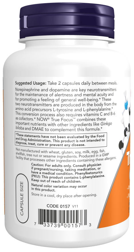 Norepinephrine and dopamine are key neurotransmitters for the maintenance of alertness and mental acuity and for promoting a feeling of general well-being.* These two neurotransmitters are produced in the body from the amino acid precursors L-tyrosine and L-phenylalanine.* This conversion process also requires vitamins C and B-6 as cofactors.* NOW® True Focus™ combines these important nutrients with other ingredients like Ginkgo biloba and DMAE to complement this formula.*