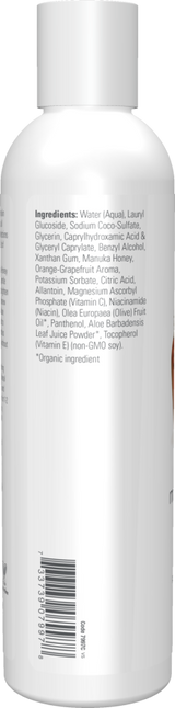 Ingredients: Water (Aqua), Lauryl Glucoside, Sodium Coco-Sulfate, Glycerin, Caprylhydroxamic Acid & Glyceryl Caprylate, Benzyl Alcohol, Xanthan Gum, Manuka Honey, Orange-Grapefruit Aroma, Potassium Sorbate, Citric Acid, Allantoin, Magnesium Ascorbyl Phosphate (Vitamin C), Niacinamide (Niacin), Olea Europaea (Olive) Fruit Oil*, Panthenol, Aloe Barbadensis Leaf Juice Powder*, Tocopherol (Vitamin E) (non-GMO soy). *Organic ingredient
