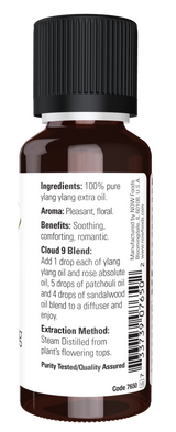 Cloud 9 Blend: Add 1 drop each of ylang ylang oil and rose absolute oil, 5 drops of patchouli oil and 4 drops of sandalwood oil blend to a diffuser and enjoy.
